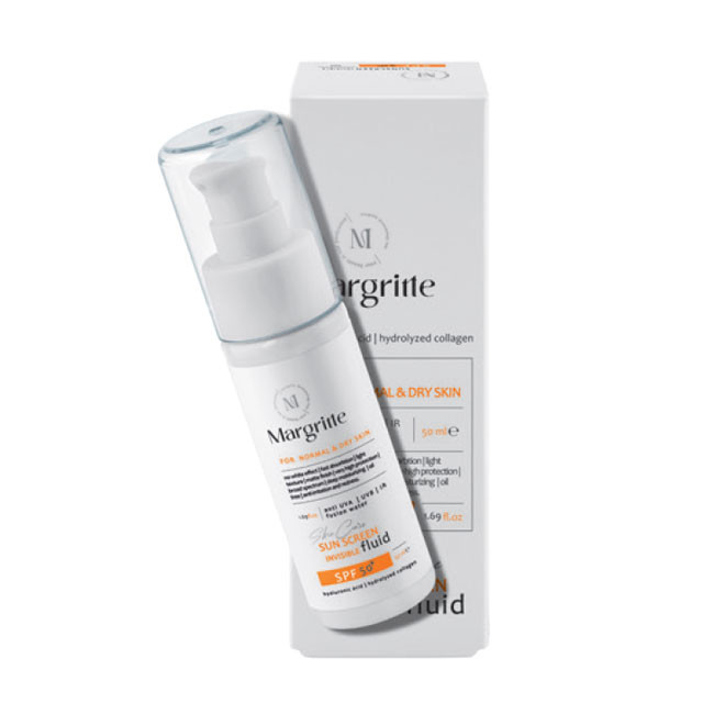 ویژگیهای فلوئید ضد آفتاب بی رنگ مارگریت SPF50 مناسب پوست نرمال تا خشک